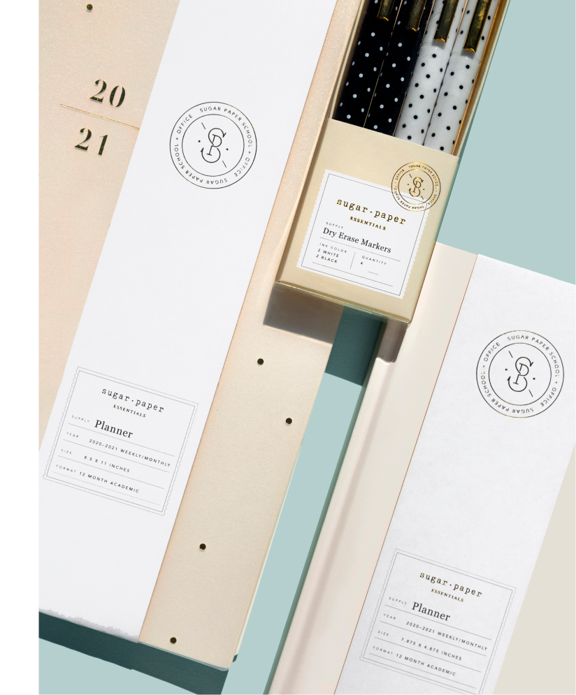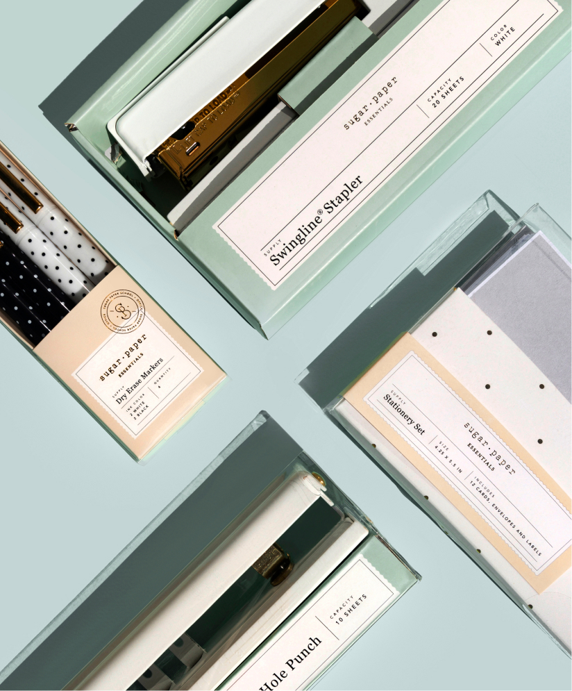 As Sugar Paper embarked on expanding their long-standing partnership with Target to include a line of office supplies, they turned to us to develop a packaging design system. Our mission was clear: create a packaging design system that exudes femininity, sophistication, and simplicity, all while delivering important product details and being adaptable to work across a range of SKUs.